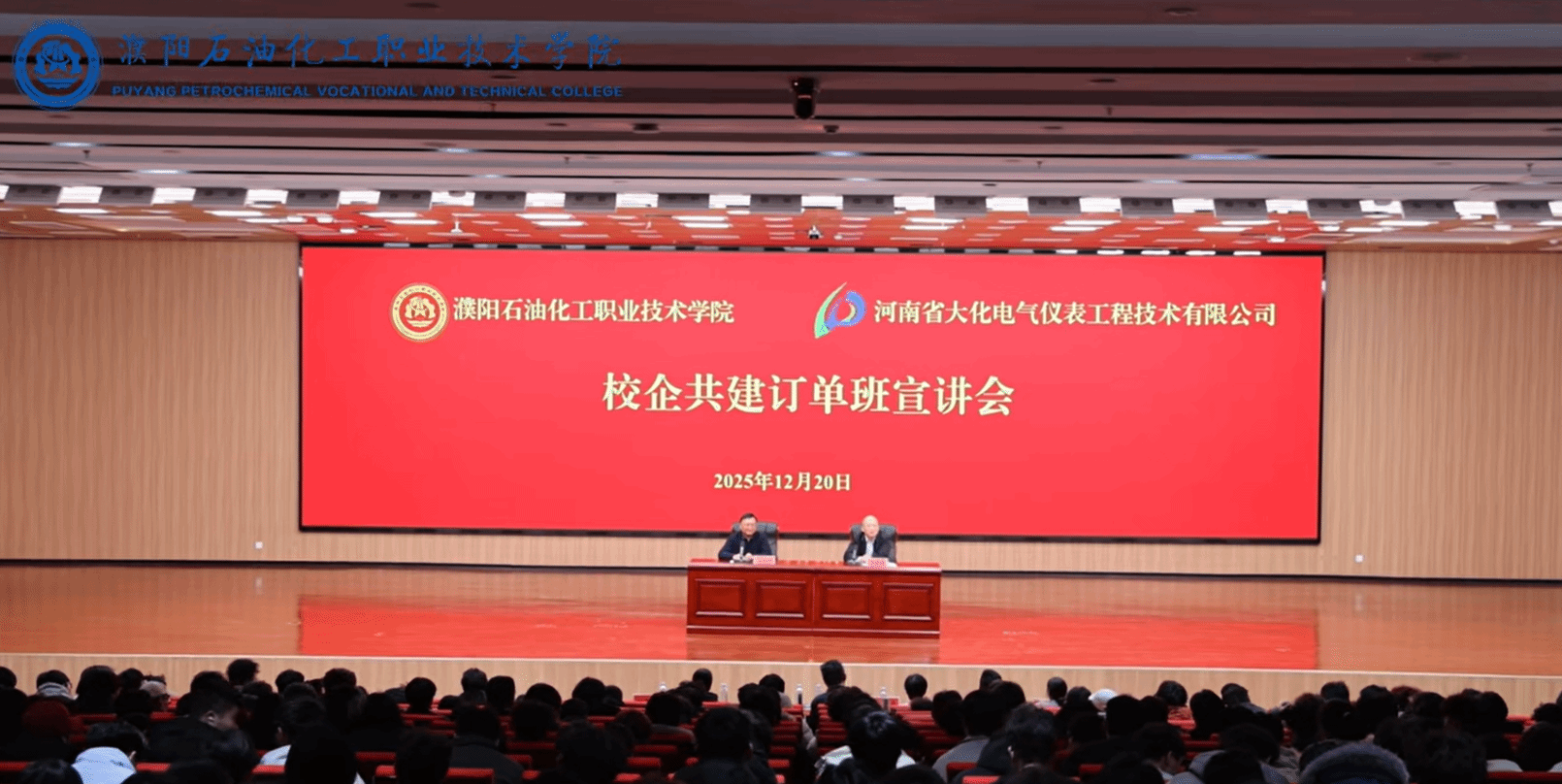 为进一步深化产教融合、校企合作,创新人才培养模式,服务区域产业发展,12月20日上午,濮阳石油化工职业技术学院与河南省大化电气仪表工程技术有限公司共建订单班宣讲会在图书馆报告厅举行。河南省大化电气仪表工程技术有限公司党委书记、董事长宋太浩受邀宣讲,学校党委书记李殿峰主持活动并讲话,企业代表、师生代表400余人参加活动。